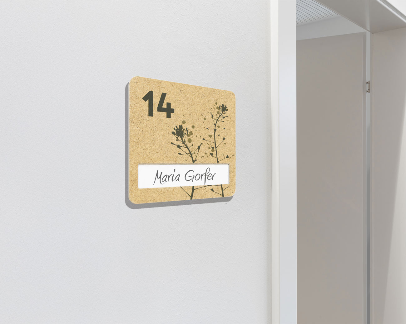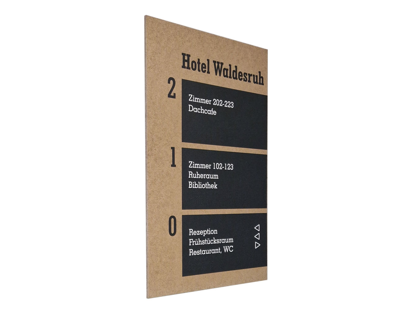 Die Basis für diese Beschilderung bilden aus natürlichen Holzfasern gepresste Holzplatten, die biologisch abbaubar sind und einer Wiederverwertung zugeführt werden können. Eine Vielzahl an Gestaltungsmöglichkeiten führen hier zu optisch ansprechenden Beschilderungen.